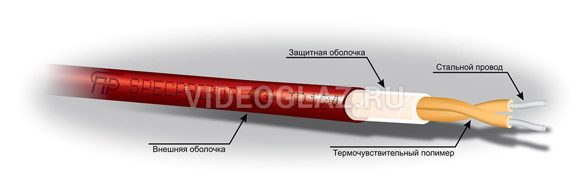 Спецприбор GTSW-СР (138,180) линейный тепловой извещатель - ИП104 «Гранат - термокабель». Извещатель пожарный тепловой линейный ИП104 «Гранат - термокабель» (в дальнейшем – извещатель, термокабель) служит для обнаружения превышения пороговой температуры как признака пожара по всей своей длине и предназначен для применения в системах пожарной сигнализации совместно с модулями «МИП» СПР.425521.007 ТУ. Англоязычное обозначение извещателя – IP104 «Granat - TermoSenseWire (GTSW)». Спецприбор GTSW-СР (138,180) представляет собой кабель, который позволяет обнаружить источник перегрева в любом месте на всем его протяжении. Термокабель представляет собой единый датчик непрерывного действия и применяется в тех случаях, когда условия эксплуатации не позволяют установку и использование обычных датчиков, а в условиях повышенной взрывоопасности применение термокабеля является оптимальным решением. Линейный тепловой извещатель Спецприбор GTSW-СР (138,180) состоит из двух стальных проводников, каждый из которых имеет изолирующее покрытие из термочувствительного полимера. Проводники с изолирующим покрытием скручиваются для создания между ними механического напряжения, затем покрываются защитной оболочкой и помещаются в оплетку для изоляции от воздействия неблагоприятных условий окружающей среды. Принцип действия термокабеля Спецприбор GTSW-СР (138,180):
