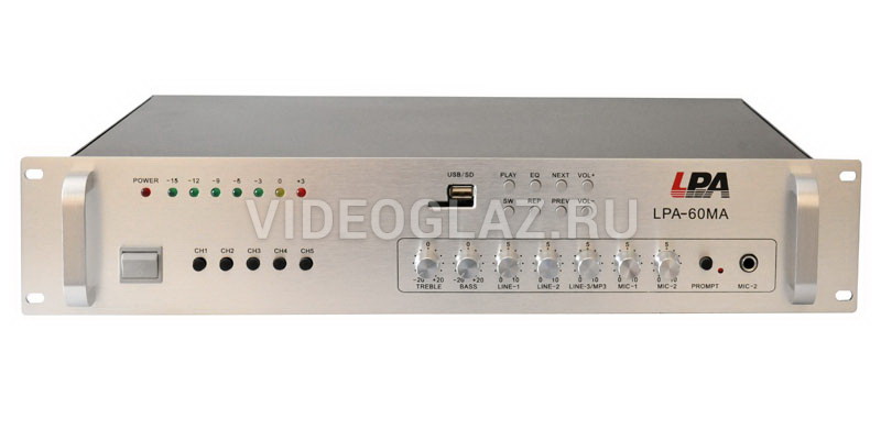 Микшер-усилитель LPA-60MA-T предназначен для построения систем оповещения и музыкальной трансляции до 5 зон. Конструкция для установки на столе или в 19” стойку. Указатель уровня выходного сигнала. Встроенный плеер MP3с управлением и поддержкой носителей USB и FLASH. Встроенная защита от перегрузок и коротких замыканий, защита от перегрева. Линейные и микрофонные входы. Раздельное управление чувствительностью каждого входа. Встроенный блок сообщений (2 сообщения) с индикацией и контролем цепей запуска. Автоматическое включение при подаче управляющего сигнала на тревожный вход. Автоматическое оповещение о пожаре. Многоскоростные бесшумные вентиляторы.