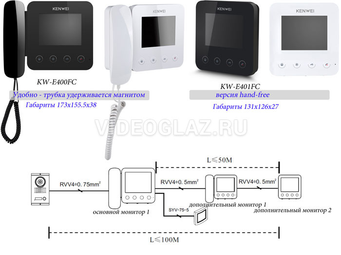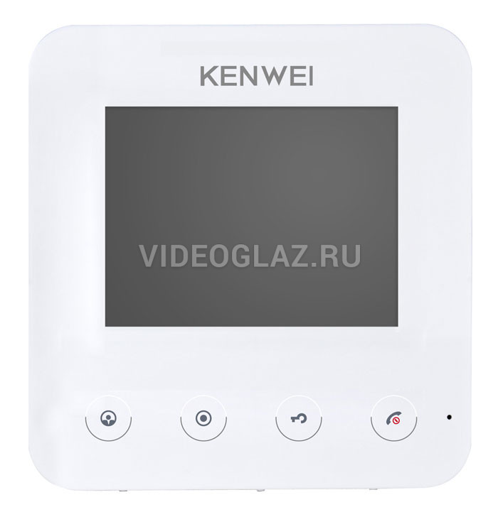Kenwei KW-E401FC белый Coordinate - Монитор цветного видеодомофона hand-free с возможностью подключения подъездного домофона координатного типа (Элтис, Vizit, Цифрал, Метаком) и 3 вызывных панелей или видеокамер, LCD TFT 4", PAL/NTSC, 12 полифонических мелодий вызова. Сенсорные кнопки. Поддерживается полноценное подключение в адресный интерком до 4 мониторов в системе только с KW-E400FC и KW-E401FC (прием вызова от вызывной панели, адресные звонки между мониторами). Подключение к вызывным панелям эл. замков для управления ими с монитора, возможность вывода изображения на внешний ЖК экран, поддержка переадресации вызовов на любой телефон с помощью KW-401G с возможностью дистанционного управления замком, функция не беспокоить, питание монитора 220В (встроенный блок питания).